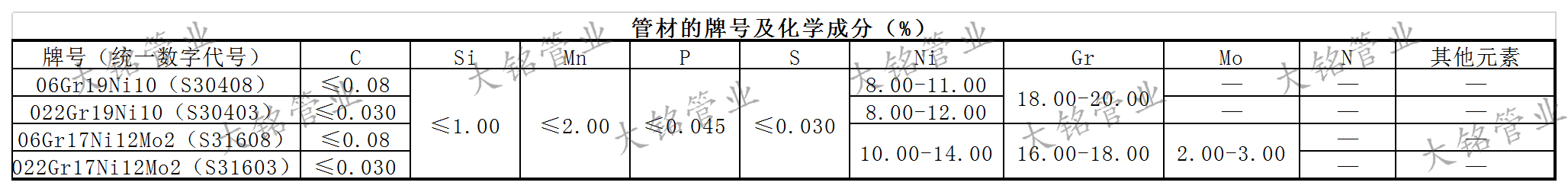 建筑給水薄壁不銹鋼管管材和管件均由含鉻(Cr)量在12%以上,并按需添加其他金屬元素所形成的奧氏體晶體結構性質的鐵合金。添加鎳(Ni)可提高材料的延展性和韌性,使加工易成型,宜彎曲。減少碳(C)含量,可提高材料的焊接性能。添加鉬(Mo)或錳(Mn)等含量,可提高材料的耐點蝕和耐縫蝕的性能。